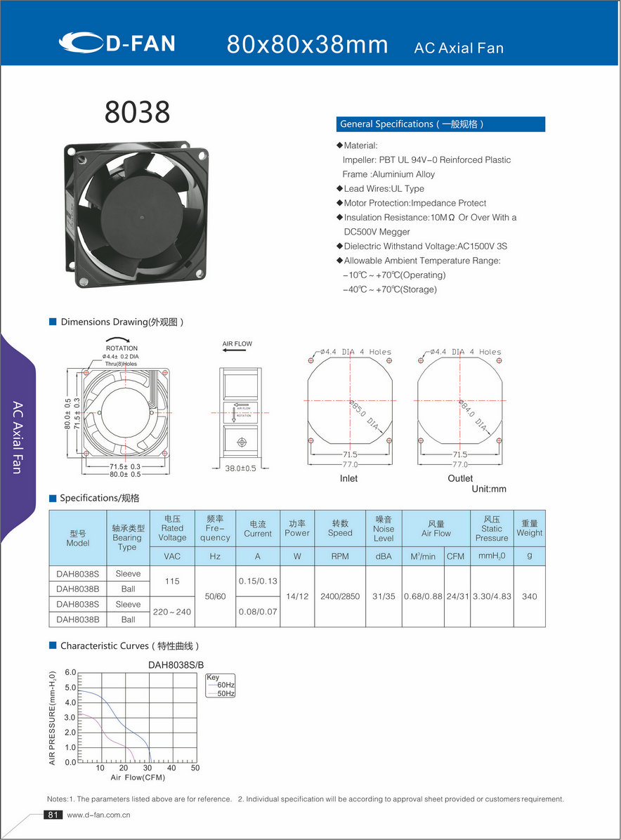 材料: 叶轮:PBT UL 94V-0增强塑料框架铝合金 导线:UL型 电机保护:阻抗保护 绝缘电阻:1欧姆或以上,带DC500V高阻表 介电耐压:AC1500V 3S 允许环境温度范围: -10℃-+70℃(运行) -40℃-+70℃(储存)